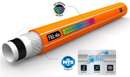 Tuyau souple présentant une structure à 6 épaisseurs avec un revêtement extérieur de couleur orange très vif avec deux lignes blanches. Pellicule SKY TECH avec formule spéciale anti-UV qui prévient le vieillissement du tuyau et crée une finition satinée particulière. Renfort textile NTS, épaisseur intermédiaire de maintien blanche, épaisseur noire anti-algue, couche intérieure de protection blanche.